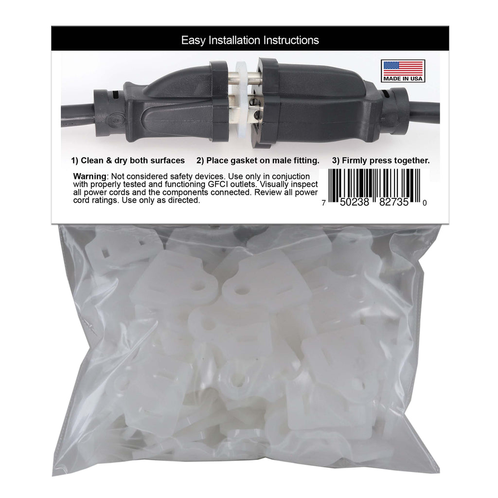 Having trouble keeping your electricity flowing because of the rain? We did too, that's why we invented Weatherproof Gaskets and Weatherproof Plug Covers. Weatherproof Gaskets fit between your plug connections to keep rain and other elements from tripping your GFCIs. Weatherproof Plug Covers fit on the end of any open-ended plug to block moisture from getting in. Using Weatherproof Gaskets and Weatherproof Plug Covers will assist your GFCIs to keep your lights on, even with rain, sleet or snow. These soft, pliable shields can save you hours and hours of time and frustration.
